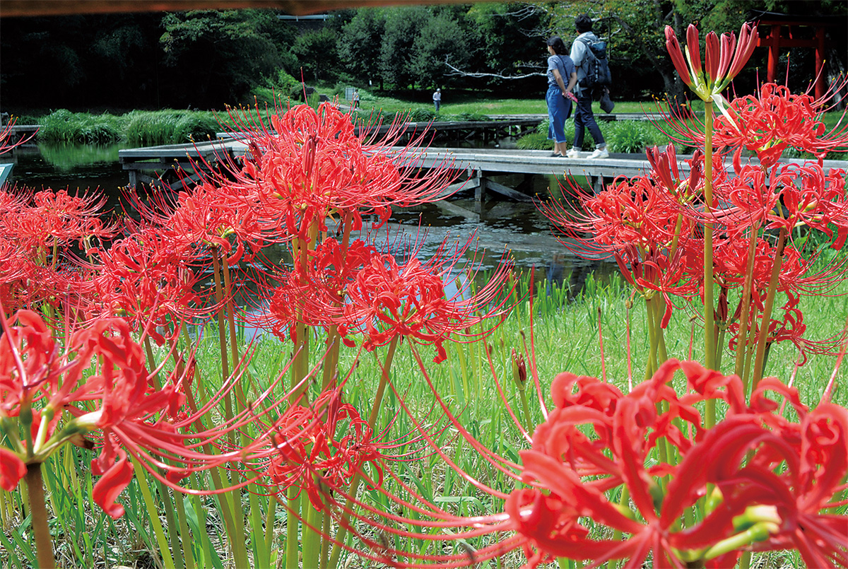 朱色のぼんぼりのような姿をした花が水辺を鮮やかに彩り、木道が巡らされた湿生地をトンボが飛び交う。湧き水が出る同公園にはカモやカワセミなどの野鳥も生息。好天に恵まれた3連休最終日の17日、バードウォッチングの愛好者や散策を楽しむ家族連れなどが訪れ、憩いのひとときを過ごしていた。