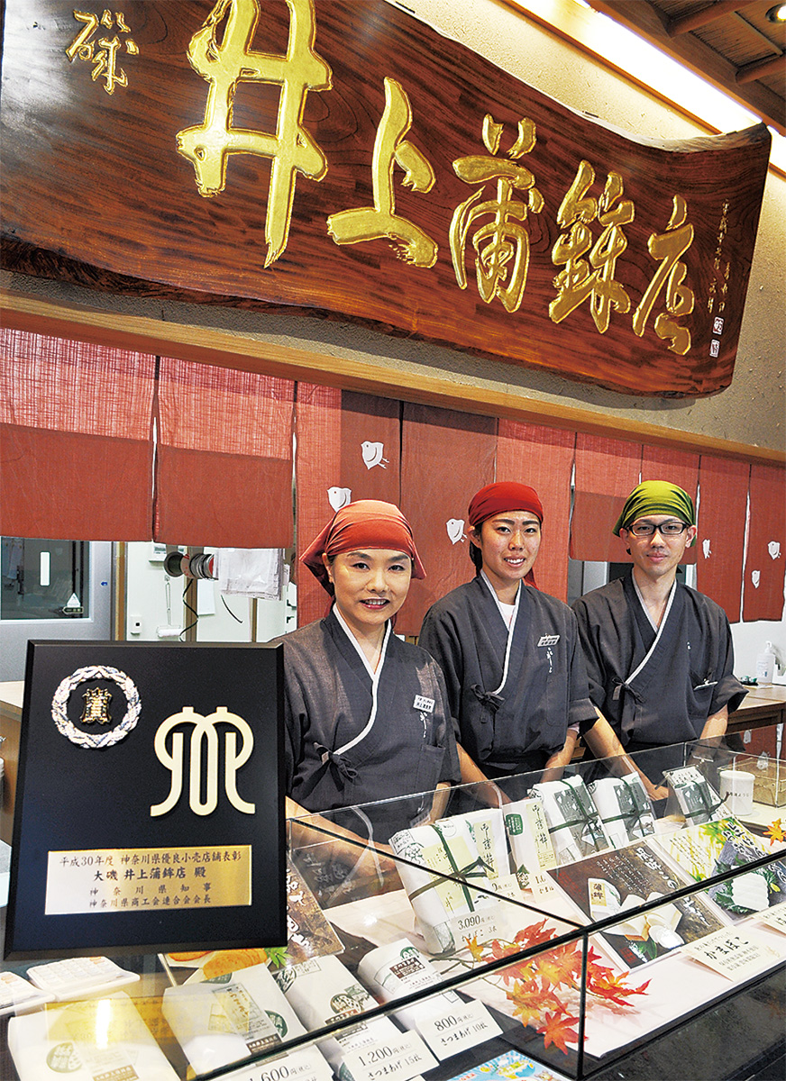 井上蒲鉾店は、大磯で明治11年に創業。かまぼこ・はんぺん・さつまあげを看板商品に代々受け継いだ製法と味を守り続けている。現在は専務の井上寧さん(53)が全体を取り仕切り、妻の真奈実さん(52)が店舗、弟の暢さん(48)が製造の責任者を務める。受賞の知らせに真奈実さんは「とても光栄なこと。井上の味を好んでくださるお客様のためにも代々の製法と味を守り、商売を続けていくことが企業の責任と思う。これからも末永く愛される店になれるよう努力していきたい」と感謝を述べた。