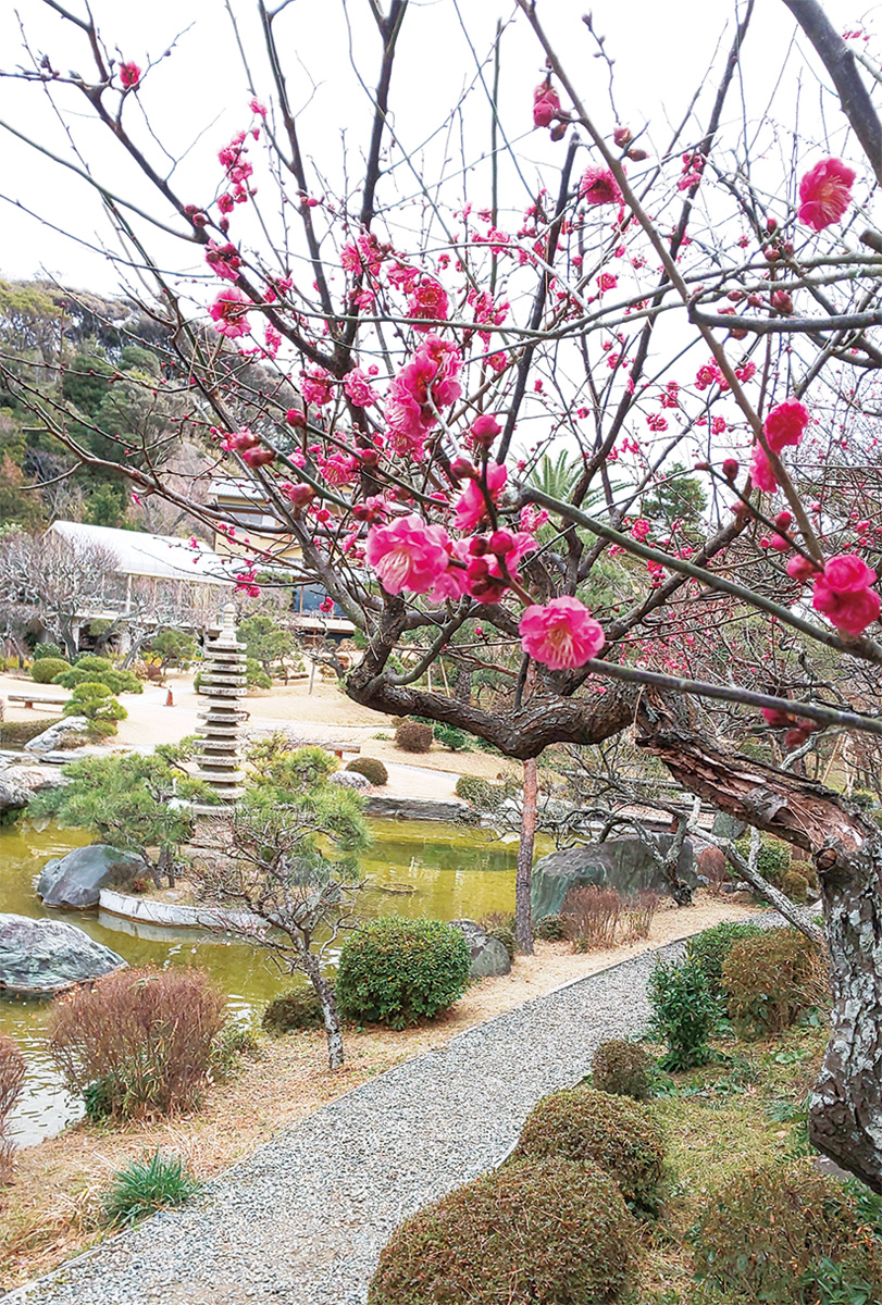大磯町で梅の名所といえば、大磯駅近くの地福寺。近代文学を代表する作家の島崎藤村が眠る同寺には、藤村が愛したという見事な枝ぶりの梅の古木が約20本、境内に佇む。開花時期ともなれば、紅梅・白梅が可憐な花びらをそっと広げて訪れる人をもてなしてくれる。1月28日時点では、先駆けの2、3輪がほころんで迎えてくれた。
