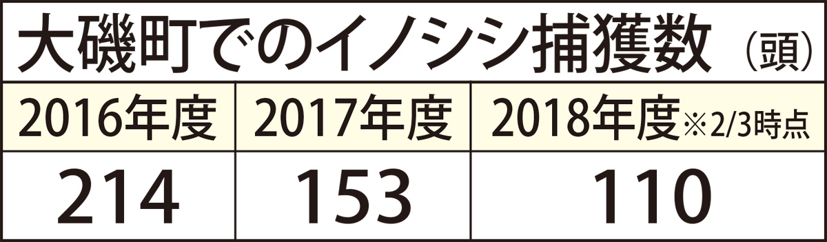 大磯町では町内に28基の箱罠を設置し、今年度は約110頭のイノシシを捕獲している。=表