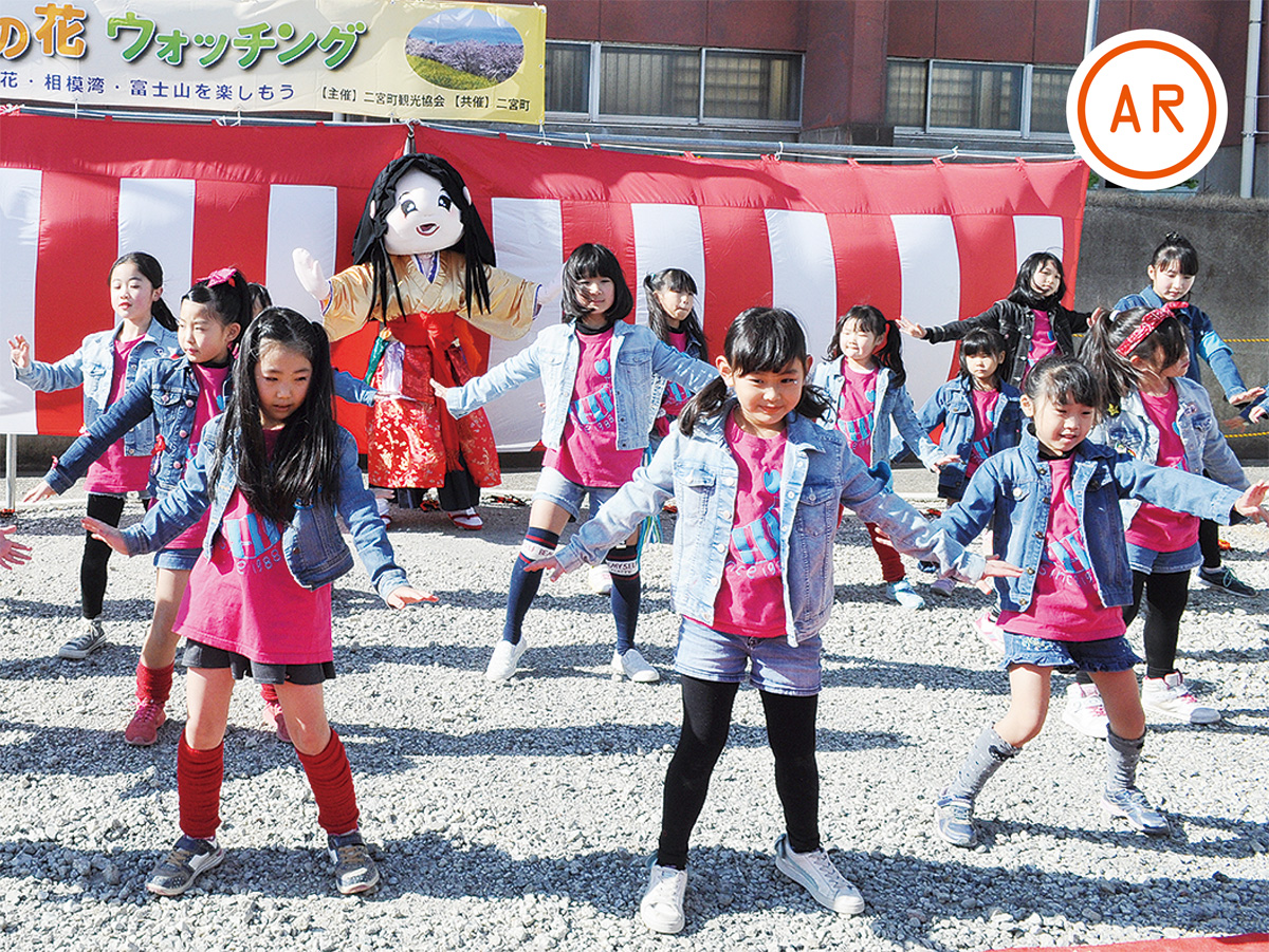 二宮ブランドのイメージキャラクター「おとちゃん」のテーマソング「愛LOVEにのみや 吾妻山物語」にのせたダンスの発表が、二宮町の駅前町民会館跡地で1月26日に行われた。