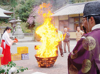 9日から12日まで開催された「雛の吊るし飾り」展に合わせて、各家庭から納められた9組のおひなさまが境内の神楽殿に並んだ。最終日、宮司によるお清めと祝詞の奏上があり、感謝の気持ちを込めてひな人形が一つずつ浄火にくべられた。