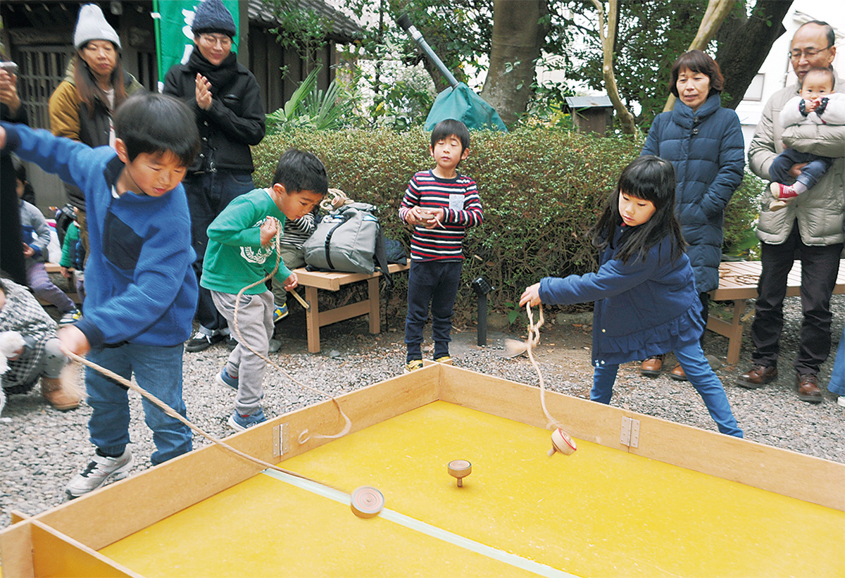 藤沢市片瀬地区を中心に湘南地域で遊ばれてきた「片瀬こま」を使う「第4回片瀬こま大会」が、2月16日に大磯町の鴫立庵で催された。町内外から親子連れなど34人が参加して、こま回しの腕を競い合った。