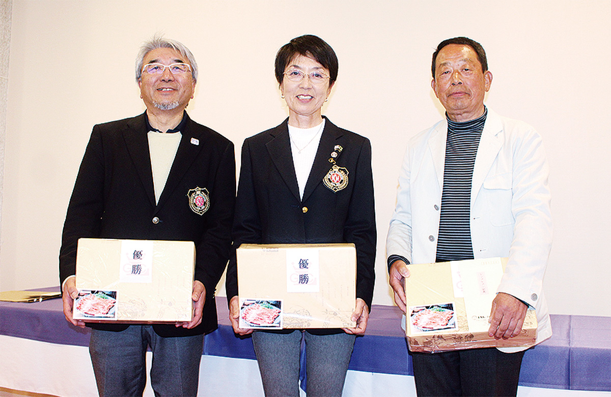 競技は18ホールストロークプレーの新ペリア方式で行われ、女子の部は、県アマチュア競技会にもたびたび出場する千葉妙子さんがG(グロス)82、N(ネット)72・4、シニアの部はゴルフ協会をまとめる理事長の簑島利文さんがG79、N73・0で笑顔のVサイン。一般男子の部は常に安定したプレーを見せた松本一夫さんがG85、N71・8で優勝した。