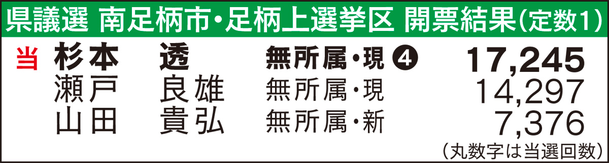 従来の南足柄市選挙区(定数1)と足柄上選挙区(定数1)が合区となり、「南足柄市・足柄上」選挙区(定数1)として4月7日に投開票が行われた神奈川県議会議員選挙は、旧足柄上の現職・杉本透氏(65・山北町)が4期目の当選を果たした。投票率は44・23%。
