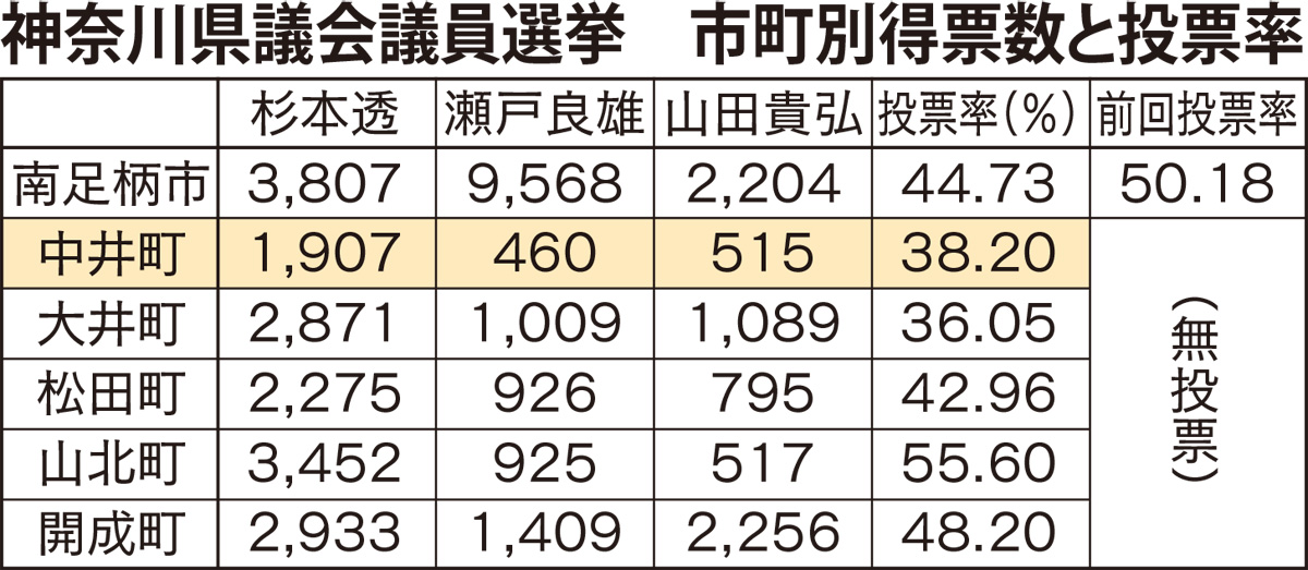 保守系の現職2人と新人1人が議席を争う激戦となった今回、次点で敗れた旧南足柄市現職の瀬戸良雄氏は「大変厳しい結果。私の不徳の致すところで、応援していただいた方々に申し訳なく思う」と頭を下げた。保守分裂の選挙になったことについては「やりづらさは余り感じなかったが、応援してくれた有権者が戸惑ってしまったのではないか」とコメントした。