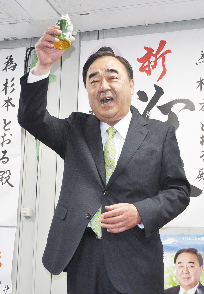 万歳三唱の後、マイクを握った杉本氏は「合区になって初めての選挙を皆さんのおかげで勝てました。涙が出るくらい嬉しい。足柄地域をなんとかしたい、連携して地方創生をやっていきたい」と話し、お茶で乾杯して支援者らと喜びを分かち合った。その後、次々と祝福に駆け付ける関係者らに笑顔で応対した。