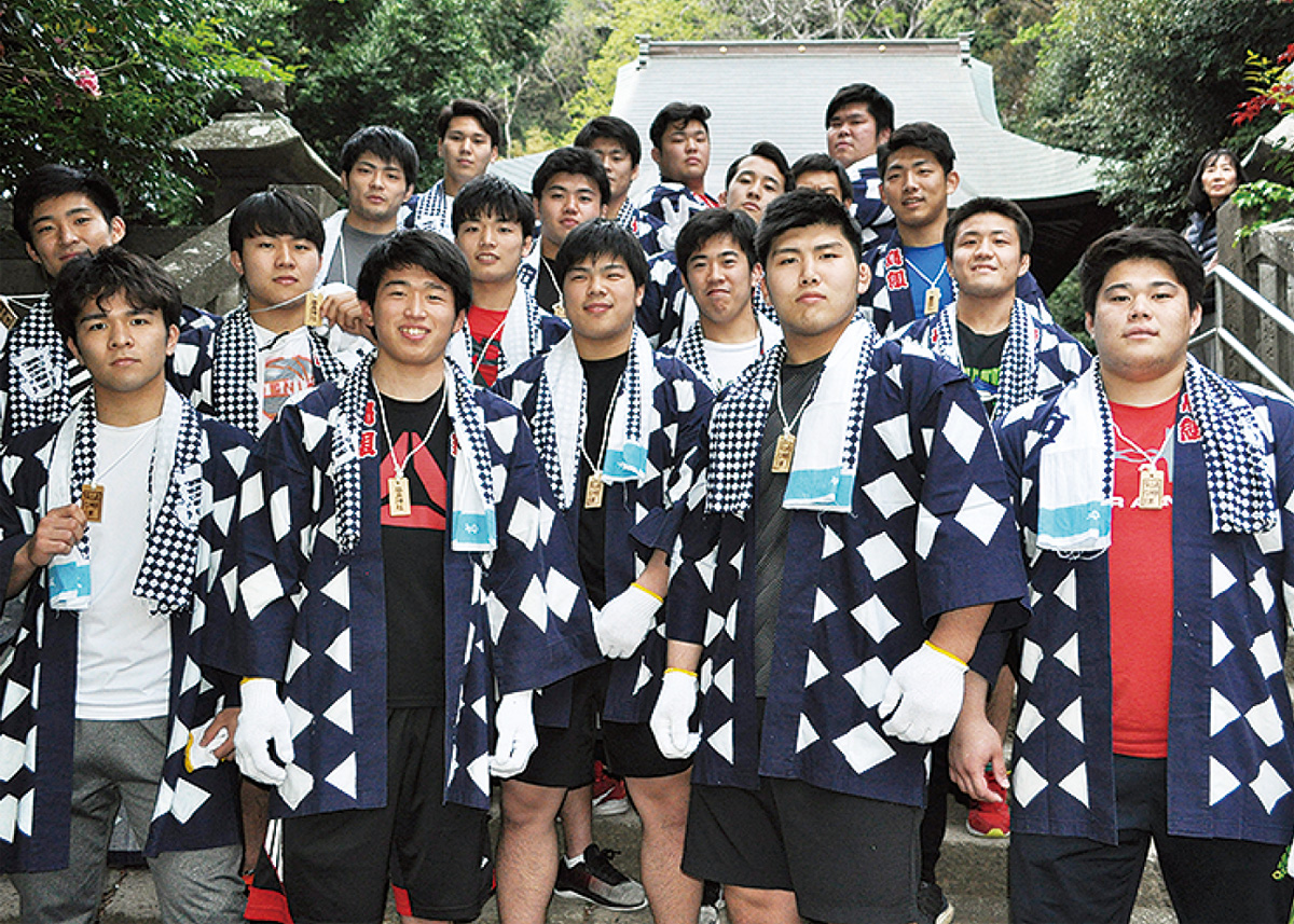 19日午後6時、境内に法被姿の男たちが集い、助っ人に東海大学柔道部19人も合流。原田会長から「平成最後の山神輿。立派に渡御して令和につなげよう」と挨拶と一本締めが行われて山頂渡御が始まった。担ぎ手たちは「ヨーソレ!」と声を揃え、互いに助け合いながら山頂を目指した。