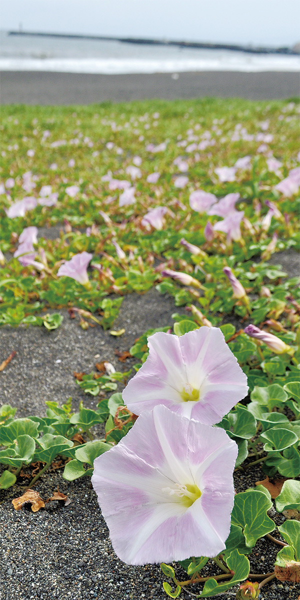 ハマヒルガオはヒルガオ科の多年草で、毎年5月中旬から6月にかけて4〜5cmほどの花をつける海浜植物。大磯町では北浜海岸の県立大磯高校前やこゆるぎの浜などに群生し、町は1998年に「町の花」に制定している。