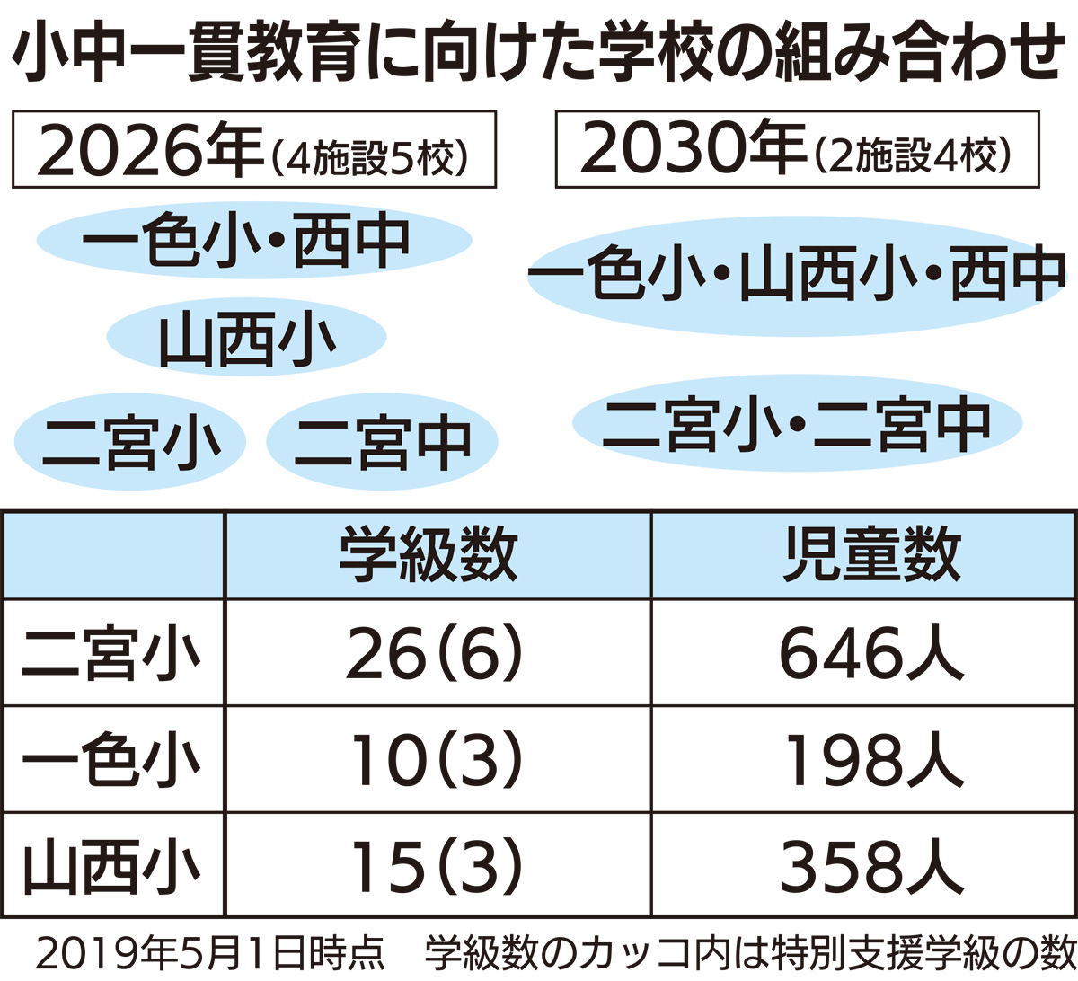 26年度に二宮西中を一色小に統合し、施設一体型の小中一貫校をつくる。山西小は西中と、二宮小は二宮中と組んで施設分離型の一貫校に。30年度からは山西小を一色小へ、二宮小は二宮中へ統合。必要に応じて学校施設の改修工事も同時に進めていく。