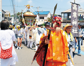今年は奇数年のため山車が出ない。神輿は午前6時に高来神社を出発。高麗・山王町・神明町・北下町・南下町・照ヶ崎を練り歩き、 西湘バイパスの下を通って式典会場(大磯港県営駐車場)を目指す。正午から神事を執り行い、巫女による浦安の舞が奉納される。