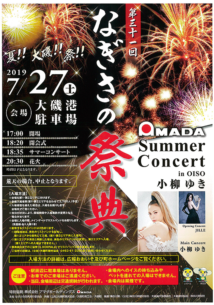 入場無料だが、入場にはメーンゲートで午後4時(予定)から先着順に配布されるリストバンドが必要。開場は午後5時、開会式6時20分、コンサート6時35分、打ち上げ花火8時30分からを予定。駐車場がないので、公共交通機関などで来場を。会場はJR大磯駅から徒歩約10分。なお会場周辺は、午後5時から9時30分まで交通規制が敷かれる。問い合わせは大磯町産業観光課【電話】0463・61・4100へ。
