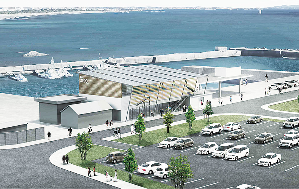 大磯港賑わい交流施設は、飲食の提供や地場産品などの物品販売を行う「賑わい創出施設」と水揚げ機能を持つ大磯二宮漁業協同組合の「漁協施設」を一体に整備するもの。町では施設整備後の大磯港と周辺一帯を国土交通省港湾局が認定する「みなとオアシス」に登録して広くPRするとともに、施設が町の周遊観光の拠点となり、人や情報の交流、賑わいの創出、マチナカ(町内各地)への賑わいの拡大などの効果をもたらすことを期待している。