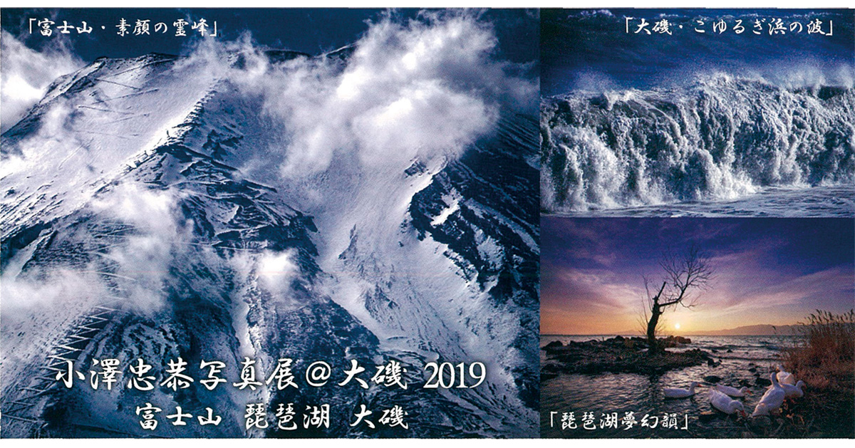 霊峰・富士の荒々しく険しい素顔や大磯のこゆるぎの浜の波濤を捉えた作品をはじめ、専門雑誌『アサヒカメラ』9月号の巻頭を飾った「琵琶湖夢幻韻」と題する作品=写真(個展の案内はがきより)=など、富士山と琵琶湖、大磯の3シリーズから展示する。