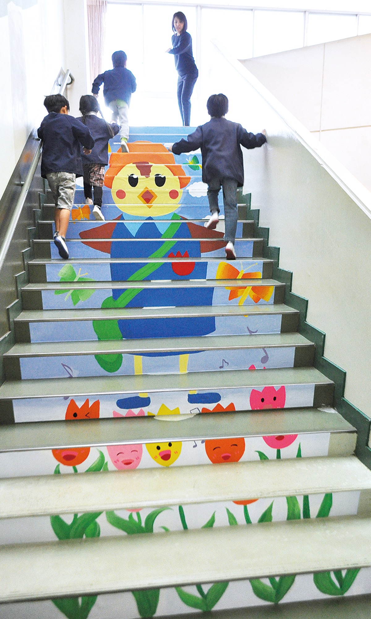 同園のオリジナルキャラクター・あそべぇの周囲をカラフルな蝶が飛び回り、顔の付いたチューリップが楽しそうに歌うデザイン。美術部員たちは11日の放課後に同園を訪れ、イラストを描いたシートを18分割して階段に貼り付ける作業を行った。翌朝に登園してきた園児たちは階段を見て大喜び。絵を眺めながら何度も上り下りを繰り返したり、声もなくじっと絵を見続ける子もいた。保護者も「すごい。可愛いね」と感激していた。