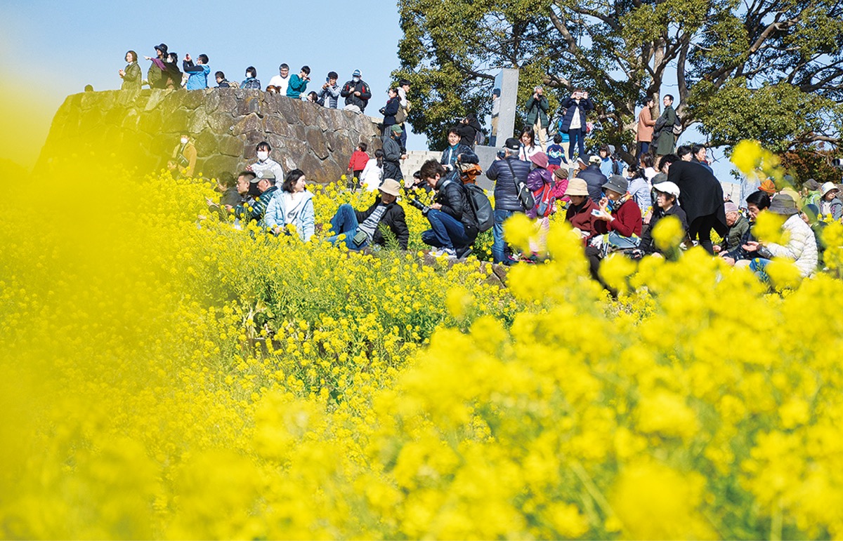 立春後の寒気が和らいだ2月8日、約6万株の菜の花が咲き誇る二宮町の吾妻山公園に家族連れや若者、中高年者の団体などが大勢訪れた。標高136mの山頂から菜の花と相模湾、富士山の眺めを楽しみながら、弁当を広げたり、写真を撮ったりした=写真上。