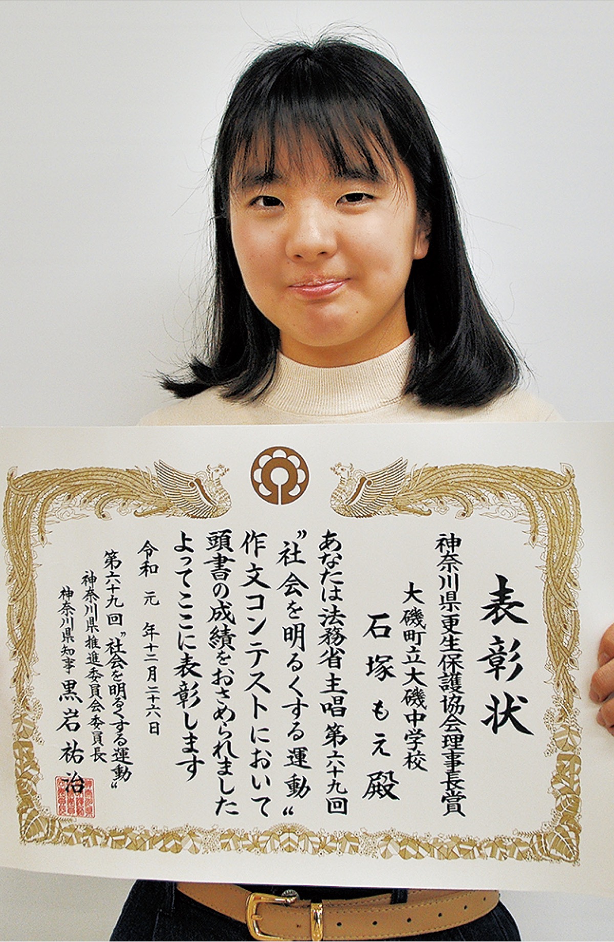 神奈川県内の小中学生を対象にした「社会を明るくする運動」作文コンテストで、大磯中学校3年の石塚もえさんの作品「ツバメと校則から社会を考える」が神奈川県更生保護協会理事長賞を受賞した。