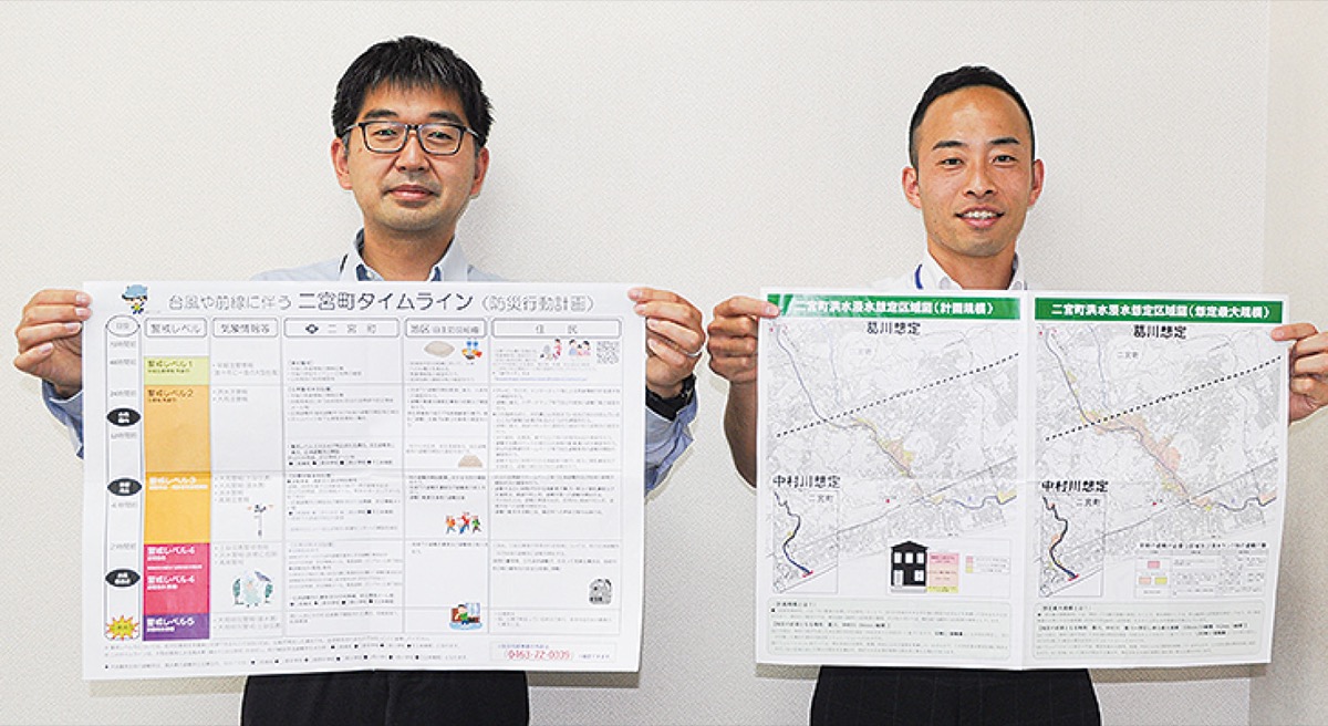 四つ折りA4。昨年の台風19号の教訓を踏まえ、行政と地区(自主防災組織)、住民が取るべき準備や行動を時系列で示すタイムラインを掲載。各世帯が風水害に備えるマイタイムラインの記入紙もある。町防災安全課は「わが家はいつ誰がどこへ避難する必要があるか考えて」と促す。