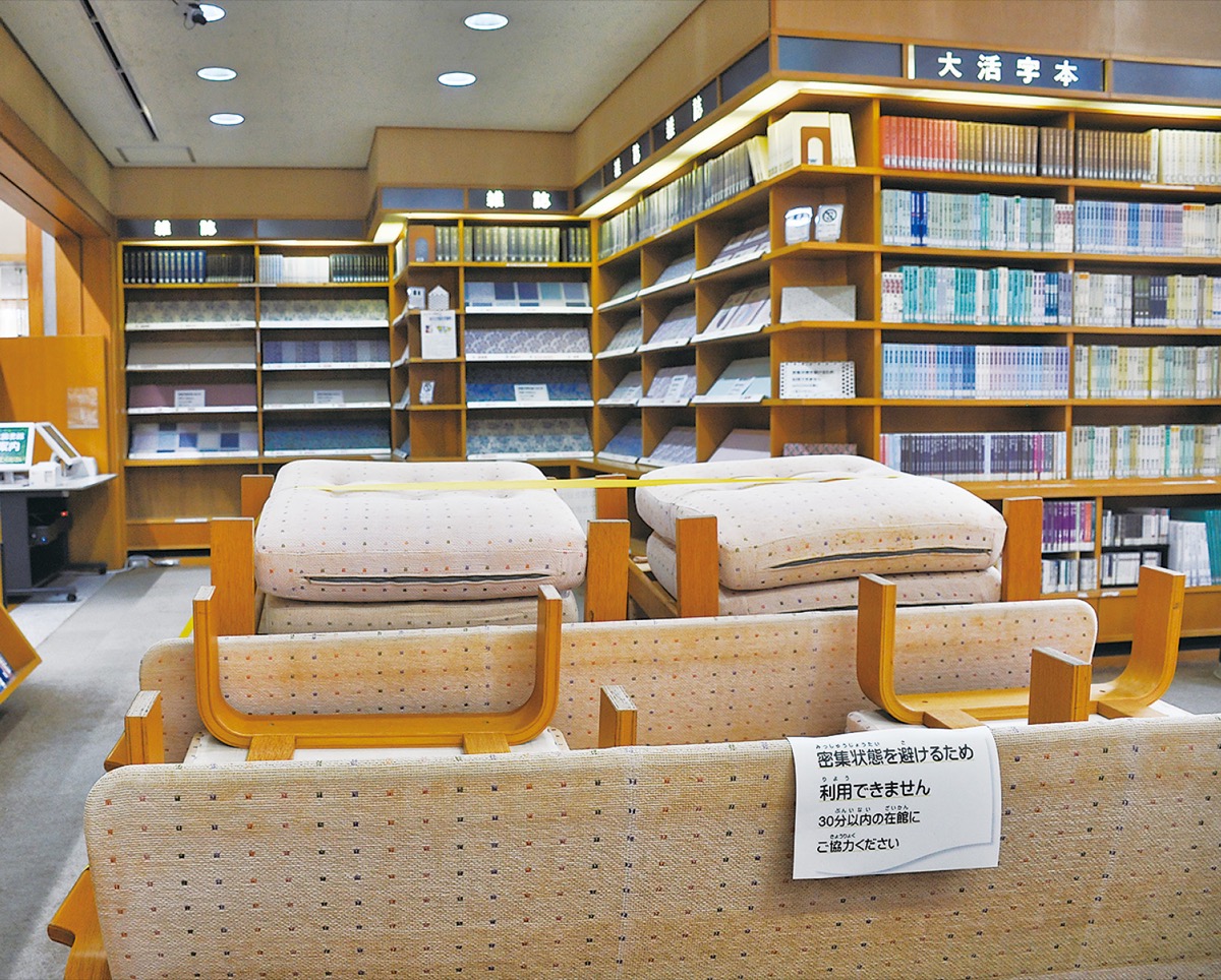 職員はマスクを着用し、窓口カウンターに飛沫を防ぐ透明のビニールシートを設置、待機列は床に目印を付けてソーシャルディスタンスの確保を促している。利用者にもマスクの着用や手指の消毒、在館時間を30分以内にとどめることなどの協力を求める。長時間の滞在を避けるため、新聞・雑誌コーナーは撤去、閲覧席も利用できないようになっている。会議室やインターネットも現時点では利用できない。また利用者が手に取った本はカウンターに持ち寄るか、わかるように本棚に横向きにして戻してもらい、職員が回収して一定期間隔離するようにしているという。(公社)日本図書館協会の作成したガイドラインを参考に、これらの対策を講じている。同館では「16日の再開から、皆さんの協力もあり大きな混乱もなく開館できている。しばらくご不便をおかけしますが、本を直接手に取って選ぶことができるように戻ったので、ぜひご利用頂ければ」と話している。