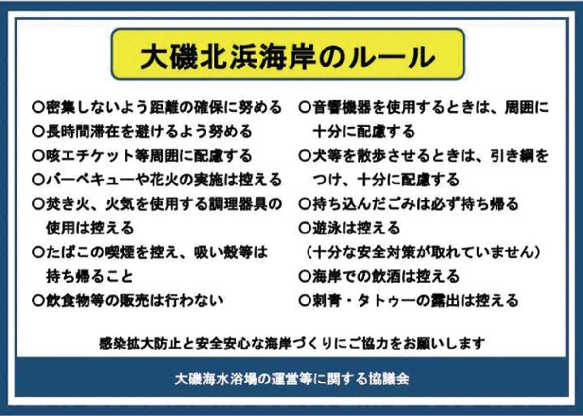 海水浴場が開設されないことで海岸が「無法地帯化」することを防ぐのが目的。密集や長時間の滞在を避ける、遊泳や花火を控えることなどを定めている。同会では会員によるパトロールや海岸に看板を設置する予定で「感染拡大防止と皆様が安全・安心して利用できる海岸維持のためにご理解とご協力をお願いします」と呼びかけている。
