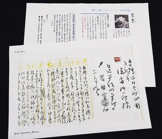 二宮町にある徳富蘇峰記念館で、明治の文豪や俳人などの書簡を複写した資料「“書”に親しむシリーズ」を制作した。夏目漱石や高浜虚子、森鴎外などの肉筆に釈文と解説が添えられている。5人分を1セットにして「在宅時間が増えた今、100年前の著名人士が書いた字や文章をじっくり楽しんで」と、頒布を始めた。