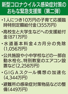感染防止へキャッシュレス決済を始める中小企業には、設備の導入費用を最大10万円、決済手数料について月額3万円を上限に補助する。このほか、避難所の感染症対策に必要な物品の整備なども進める。