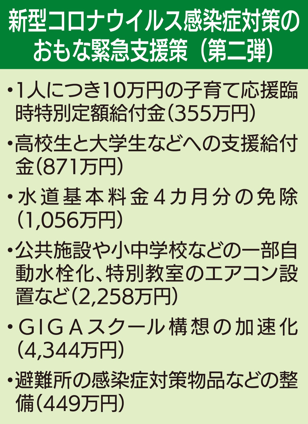 コロナ禍の長期化を踏まえ、町内の各世帯と事業者に対し、8月から11月まで4カ月分の水道基本料金を免除する。また、小中学校の修学旅行のキャンセル料の補填なども行う。