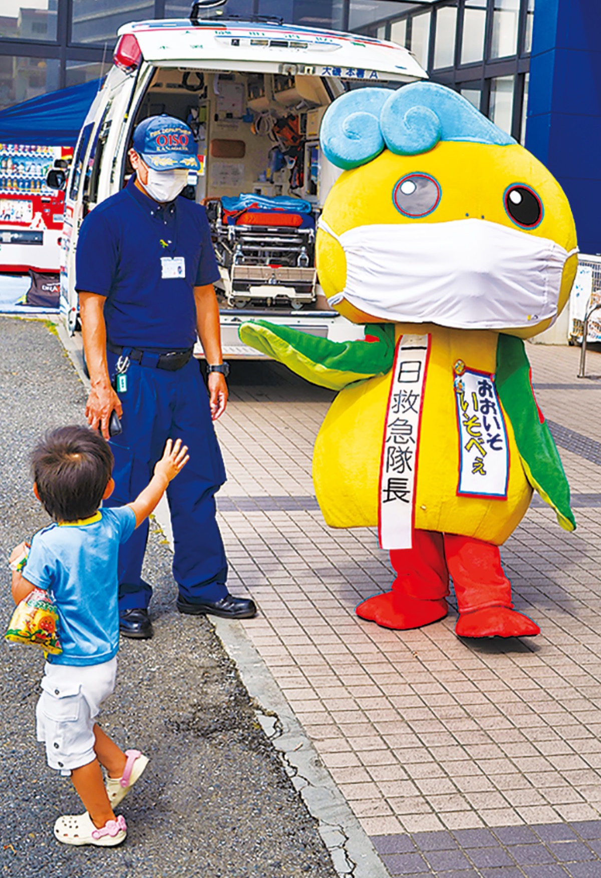 大磯町消防本部は、9月9日の「救急の日」にちなんだ救急業務の啓発イベントを6日にスーパーたまや大磯店前、9日にJR大磯駅前で実施した。町の観光キャラクター「いそべぇ」も一日救急隊長として参加し、救急隊員と一緒にマスク姿で買い物客や駅利用者らに救命講習の受講や救急車の適正な利用を呼びかけた。