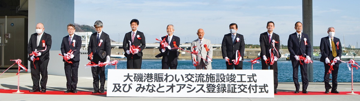 みなとオアシスは、港を核としたまちづくりを推進するための施設を国土交通省港湾局長が登録するもの。大磯港は全国で147カ所目になる。その中核となるオオイソコネクトは延床面積1006・31平方メートル、鉄筋コンクリート造2階建ての建物に漁協施設と、物品販売や飲食提供スペースのある賑わい創出施設を併設する。1階の物産店では鮮魚や地元産の野菜・果物、加工品などを販売し、2階に開業するレストランでは地元食材を使った料理が提供される。施設の管理運営は、群馬県で日本有数の道の駅を運営する田園プラザ川場が務める。式典に出席した同社の永井彰一社長は「これまでに培ったノウハウで、大磯の特色を生かした施設づくりをしていきたい」と語った。賑わい交流施設は21年2月末にプレオープン、3月末に全面開業する予定。