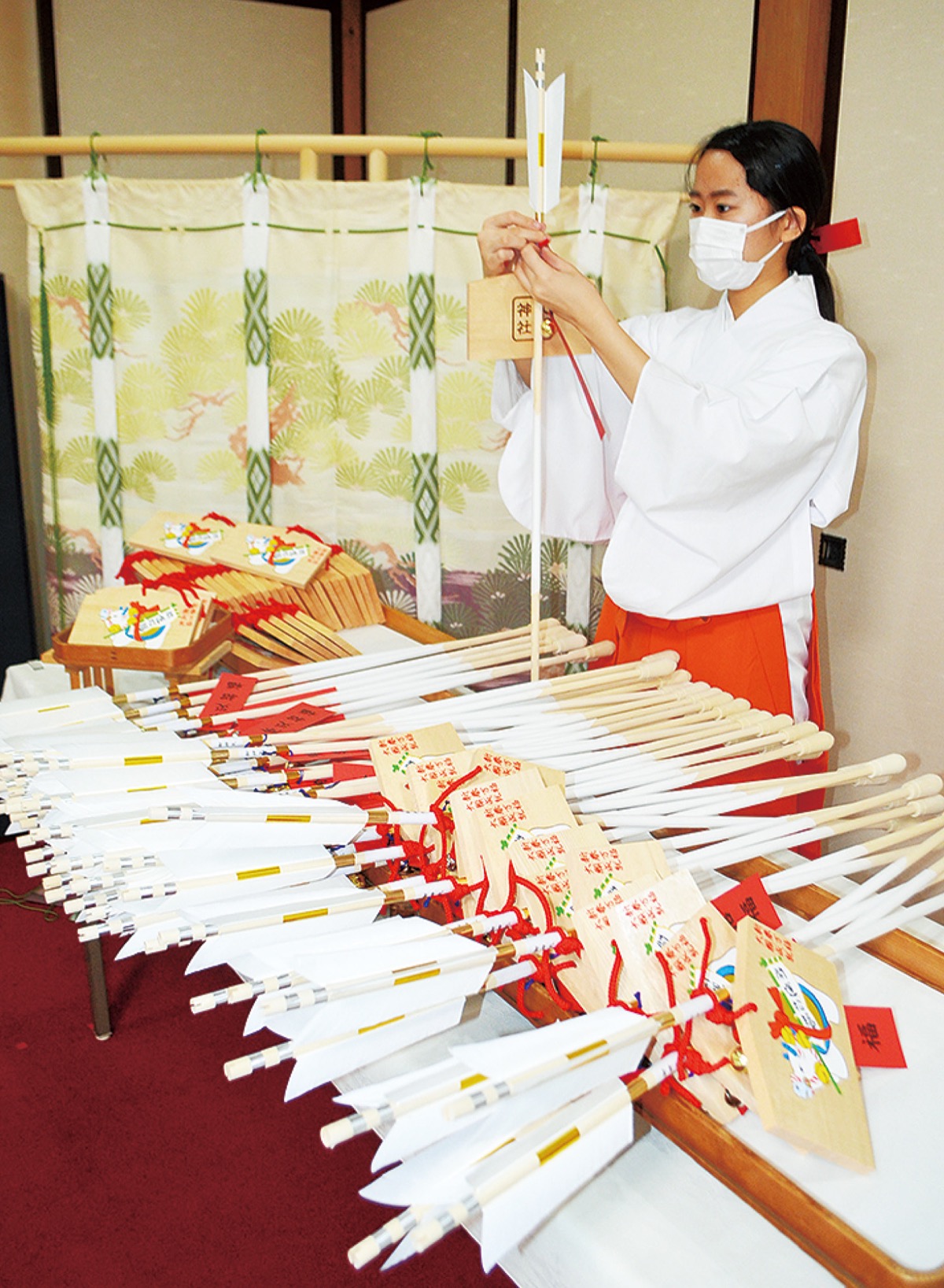 大磯町の六所神社では、新年に向けて巫女の研修が始まった。緋色の袴を身に付けたアルバイトの女性たちが、神社やお守りに関する知識、巫女の立ち居振る舞いや言葉遣いなどについて学んでいる。厄除けや家内安全を願う破魔矢の準備も始まり、マスク姿の巫女が破魔矢に来年の十二支のうしが描かれた絵馬を一つひとつ丁寧に取り付けていった。