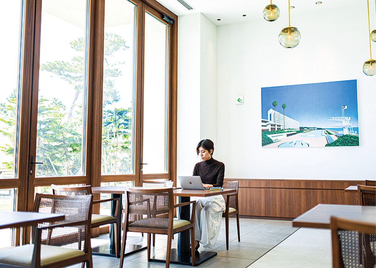 大きな窓から青く広がる太平洋とホテルのガーデンが望める抜群の環境。館内はWi―Fiが完備され、ワークスペースにはプリンターや電源、ドリンク(コーヒーや水)も提供されている。利用時間は午前10時から午後5時まで。予約不要、直接ワークスペースで受け付けを。食事や待ち合わせ、会議などの声出しは不可。