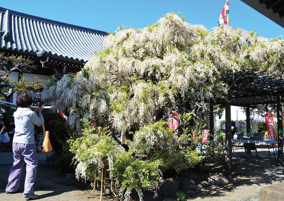 二宮町山西にある真言宗の梅沢山等覚院で4月中旬、白いフジの花が満開になった。12年に一度行われる相模新西国三十三観音の御開帳と時期が重なり、札所巡りに訪れた人たちの目を楽しませた。普段は扉を閉めている薬師堂の聖観世音菩薩が4月16日から20日まで公開され、参拝者の女性は「フジがみごとに咲いていて、よいときにお参りができました」と笑顔を見せた。