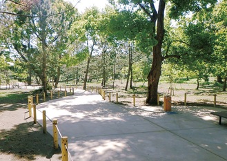 新たに公開されたのは、旧大隈重信別邸と陸奥宗光別邸跡の庭園に隣接する松林。昨年11月から始まった第1期開園で公開されている庭園と接しているものの、これまでは整備中のためロープが張られ、来園者が立ち入りできないようになっていた。松林の中には遊歩道が敷かれ、水飲み場1カ所と4基のベンチが設置されている。水飲み場のあるベンチの傍らには、大隈重信の故郷・佐賀県の県木であるクスノキが植栽されており、その木陰で休憩することができる。町担当課は「今後も順次、整備を進めて参ります。開園区域の散策を楽しんでいただければ」と話している。