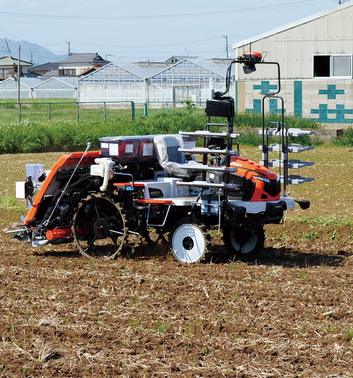 機種は、クボタ田植機アグリロボNW8SA。農業機械メーカー初の無人自動田植機で、(株)クボタが約2年かけて開発し、昨年10月に販売を開始した。本来、田植えにはオペレーターに加えて苗の補給などをサポートする補助者が必要だが、アグリロボは自動運転機能によって、田植え作業の省人化と作業効率の改善を実現している。