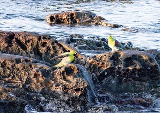 海水を求めて毎年5月から10月にかけて照ヶ崎海岸へ飛来するアオバトが、今年も4月下旬から姿を見せている。