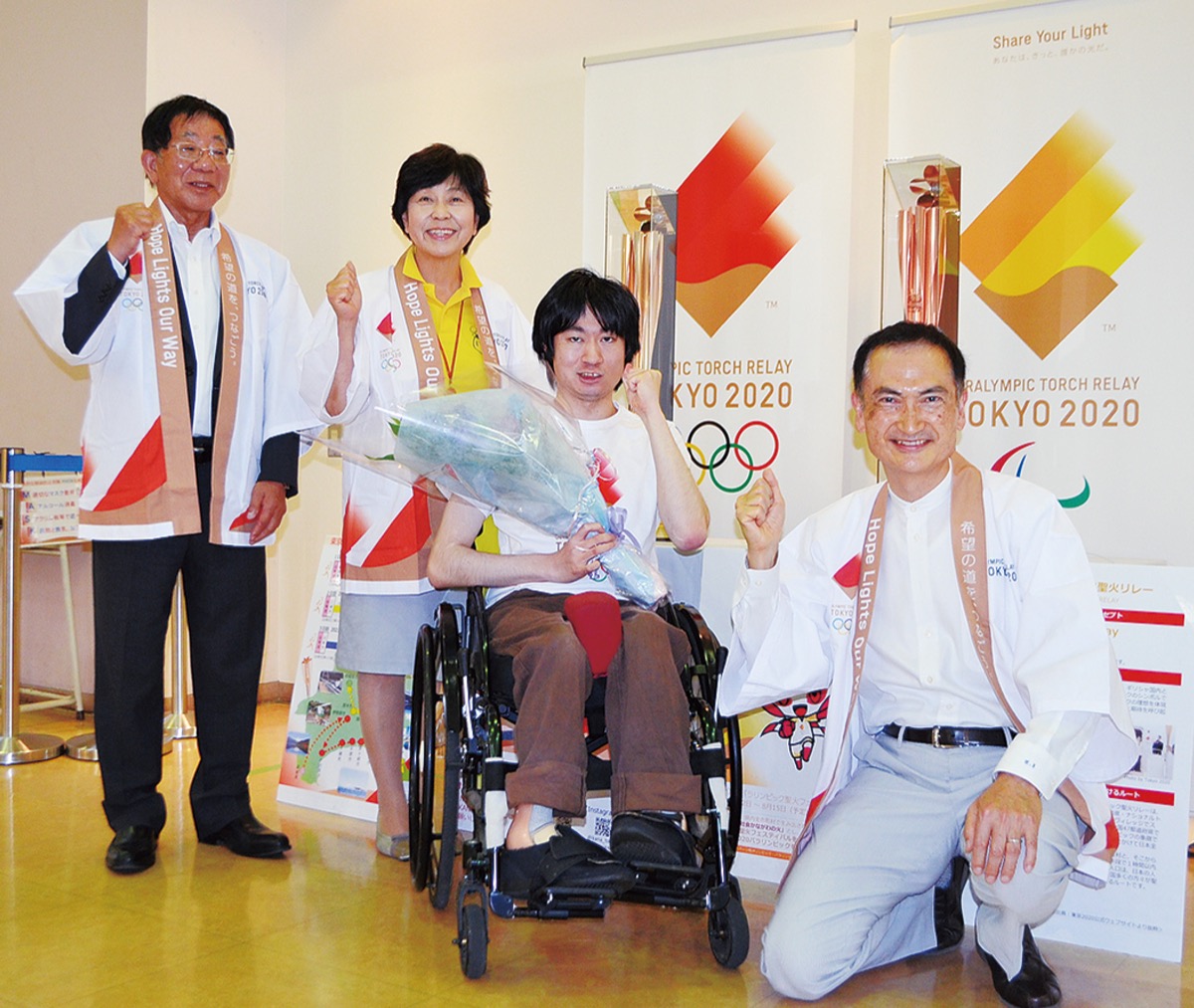東京2020五輪・パラリンピック聖火リレーのトーチが、二宮町生涯学習センターラディアンで5月26日と27日にお披露目された。初日には神奈川県の聖火ランナーに選ばれた同町在住の山崎貴裕さん=人物風土記で紹介=が来場。村田邦子町長と善波宣雄町議会議長、池田東一郎県議会議員、「東大跡パラスポーツの会」の会員などから激励を受けた。