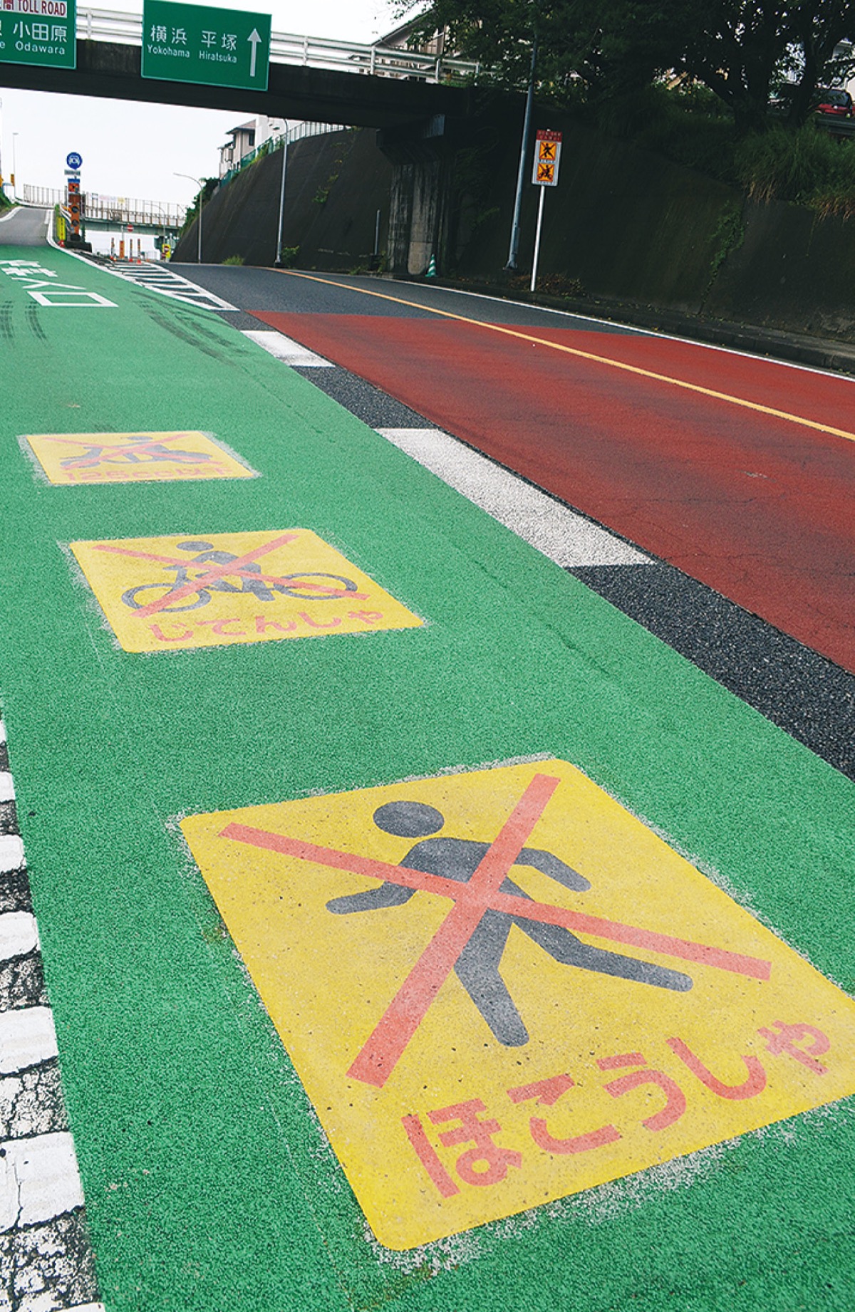 「ここから先 西湘バイパス 入らないで!」。国道1号線二宮交差点からバイパスへ向かう道路の右側。大人の腰より低い位置に横長の看板が掛かっている。歩行者や自転車の通行を遮るような恰好だ。左側の箱根・小田原方面進入口の路面には、ピクトグラム(絵文字)と平仮名でカラーシートが施してある。「はいっちゃだめ」と書かれた看板もある。