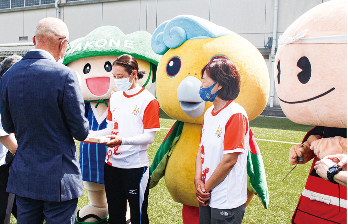 この日は勝俣浩行箱根町長も同行し、ブータンのカルマ選手に同町の特産品を手渡してエールを送った。