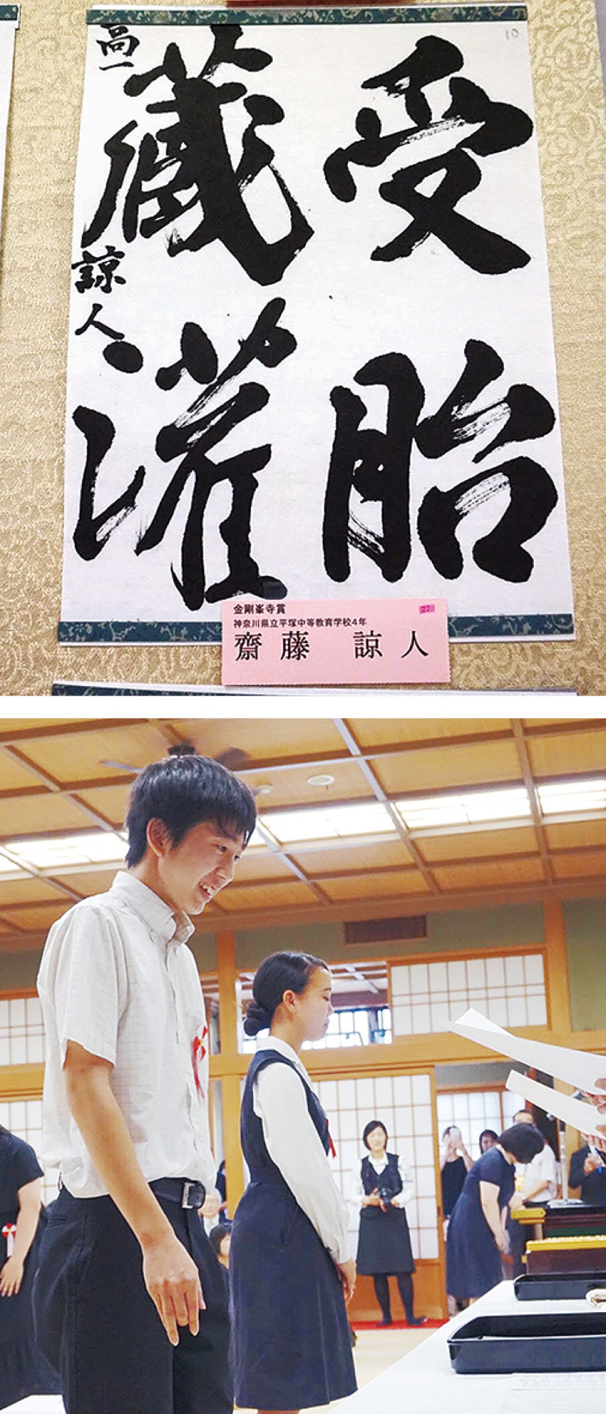 大磯町で生まれ育った齋藤さん。幼い頃から字を書くことが好きで、小学2年から書道教室に通い始めた。一昨年に同大会で金剛峰寺賞を受賞。高野山の授賞式に招かれたとき、弘法大師の実物の書を見て衝撃を受けた。以来、猛練習を重ね、今年さらに上位の賞を受賞することができた。齋藤さんは「今は受験で一休み。でも一般の部に移っても書道を続けていきたい」と話した。