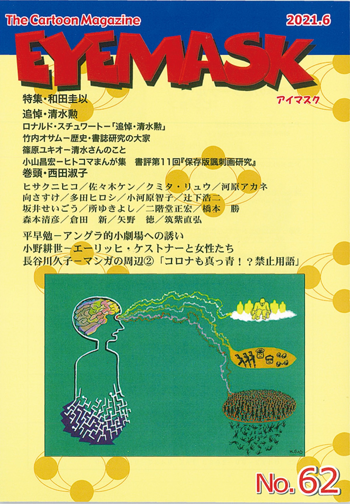 『EYEMASK』は世相や政治風刺、ナンセンス系、似顔絵などの1コマ漫画を中心に評論やエッセイ、短詩、投稿欄などで構成。30年以上前、発行編集人の野谷真治さんが学生だったときに創刊した。当初は文芸同人誌を出そうとしていたが、漫画の同人も多かったことから、漫画だけで1冊の本を作り始めた。学生やセミプロに交じり、協力者の紹介でプロ漫画家たちも執筆に加わった。二宮町に住む森本清彦さんが第2号から表紙画を担当している。