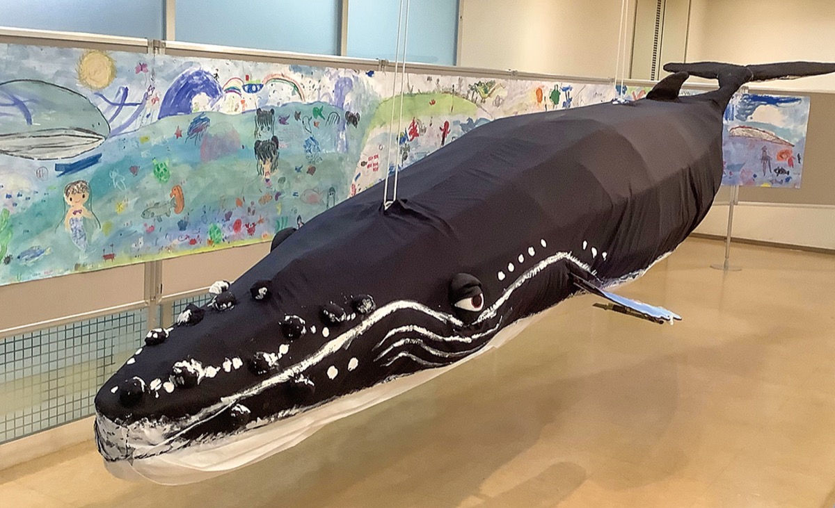 二宮町の小学生らが、ザトウクジラの子どもとほぼ同じ大きさで全長6mを超えるクジラの模型をこしらえた。海に暮らす多彩な生き物をのびのびと描いた、長さ10mに及ぶ絵巻も制作。生涯学習センターラディアンで8月17日から20日まで展示された。