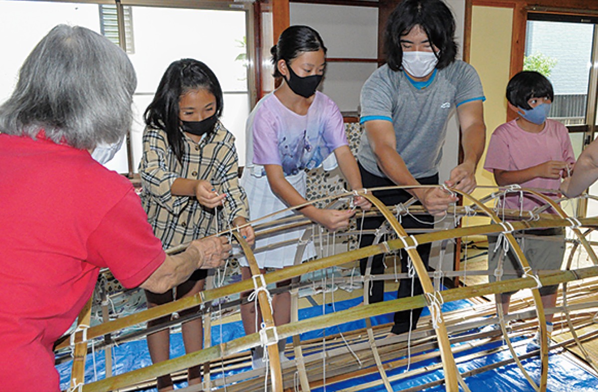 作業は感染症対策を取り、グループごとシフト制で行った。小学生たちは竹材の交差部分を凧糸で器用に縛り、骨組みに和紙を張ってその上から布を被せた。クジラの顎にフジツボを模した突起を付けるなどして、リアルな模型を完成させた。