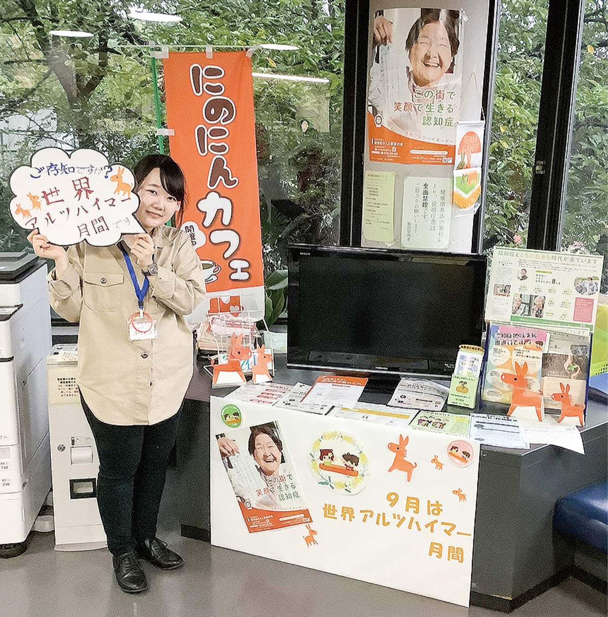 9月3日までの1カ月間、町高齢介護課で実習を行った法政大学現代福祉学部3年の浮川彩乃さんがコーナーづくりを担当した。町のPRキャラクター「ニーノとミーヤ」のイラストや、認知症になっても安心して暮らせる地域づくりのシンボルであるロバの切り抜きなどをあしらった。