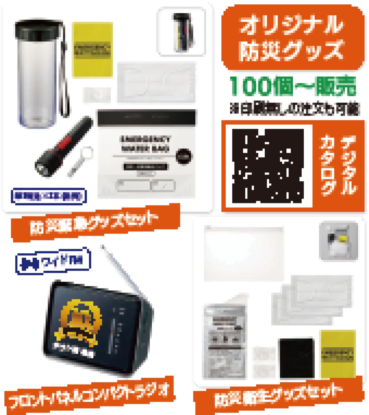 バッグに入るほどの大きさで、いざという時に役立つアイテムを詰め合わせた「防災衛生6点セット」(586円〜)や、ライトやウォータバッグなどの避難時に活躍する「防災緊急セット」(820円〜)、電波障害に強いラジオ(1656円〜)などを取り揃えている(それぞれ100個から販売)。自治会や学校、その他団体で配布して、非常時の備えとして持っておくと安心できそうだ。商品の詳細は、左上の二次元コードから確認できる。