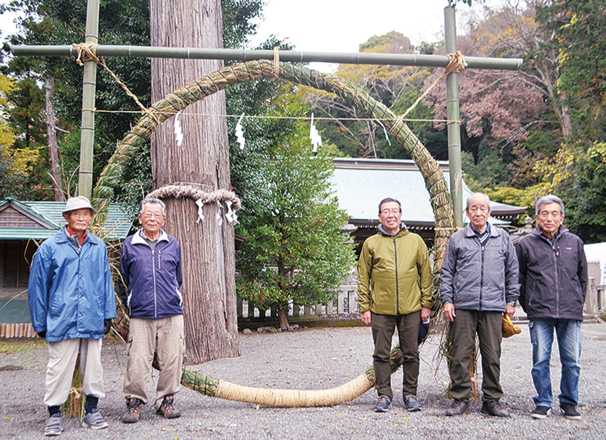 川勾神社で12月8日にすす払いがあり、氏子総代など神社関係者が竹笹の葉で拝殿の軒下のほこりを落とした。疫病を払い除ける力があると伝えられている直径およそ2・5mの茅の輪づくりも行った。茅の輪を毎年こしらえて9年になるという副総代長の小林義明さんは「材料の茅を入手するのが困難になってきたが、例年どおりに完成させることができた」と胸をなでおろした。