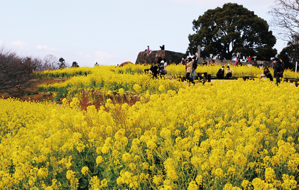 二宮町の吾妻山公園で菜の花が盛りを迎え、散策に訪れた人や写真愛好者らが一足早い春を楽しんでいる。標高136mの山頂斜面に約6万株が開花し、富士山や丹沢、相模湾、伊豆半島などを望む絶景が広がる。公園管理事務所によると、今シーズンは例年に比べて菜の花の生育が早く、年明けから見ごろになったという。