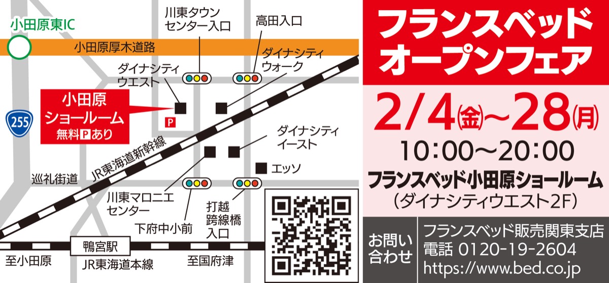 ホテル納入実績No.1、数多くの宿泊施設に導入されているフランスベッドが2月4日(金)、ダイナシティ小田原ウエスト2Fに新ショールームをグランドオープン。2月28日(月)まで、「フランスベッド小田原ショールームグランドオープンフェア」を実施している。