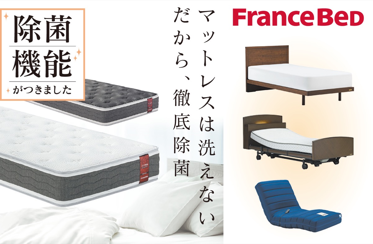 テレビCMで話題の「除菌機能つき」マットレスや高品質な国産ベッド、快適な電動リクライニングベッド等、品揃え豊富に用意。全品、オープンを記念した特別価格で提供される上、期間中は送料・設置料無料に。さらに、タウンニュース特典(当紙面持参)とし、期間中ベッドを購入した人に、ベッドと同サイズのマットレスカバーをプレゼントとお得感満載なフェアになっている。