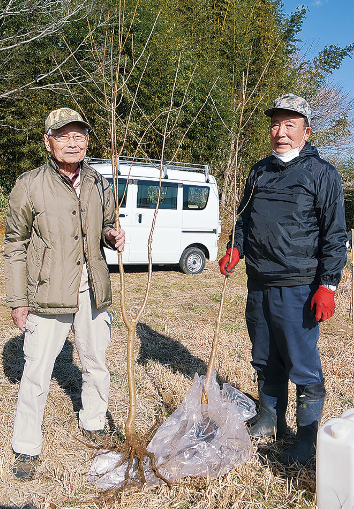桜の寄贈は、1月21日に齊藤さんから苗木を譲り受け、翌22日にオンラインで開催された協定締結記念講演会にも参加していた鈴木教夫さん=大磯町寺坂在住=が「友好の証として美郷町に大磯小桜を贈っては」と思いつき町に提案。町が齊藤さんに相談し苗木の提供を受けることが決まり、美郷町からも歓迎すると返答があったことで実現した。2月7日に西小磯の圃場で苗木の掘り取り作業が行われ、挿し木から約5年の苗木2本が用意された。作業に立ち会った齊藤さんは「自分では考えもしなかったことで、とてもうれしい。美郷町の皆さんに喜んでもらえれば」と話し、大磯町も「協定締結のシンボルとして、美郷町の方々が大磯町を身近に感じてくださるきっかけになれば」と期待する。