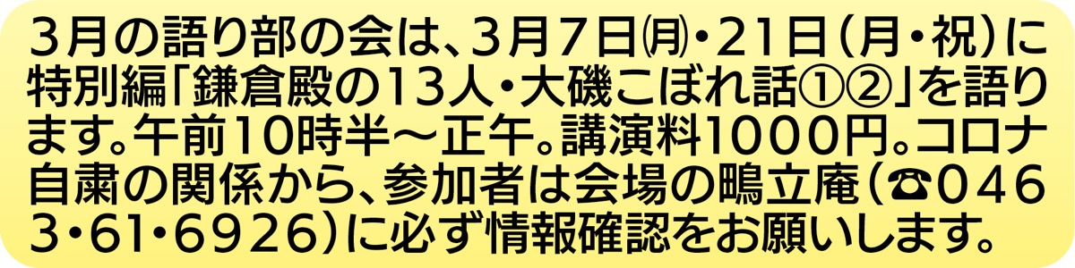 今号から江戸に上がる善次郎を語りますが、もう1歩だけ寄り道のお話をさせて下さい。大河ドラマをご覧になっていますか。実は3月の語り部で「鎌倉殿の13人」の大磯こぼれ話をしますが、そこでは語れない安田家のもう一つのルーツのお話です。大河ドラマの初回でご案内していたと思いますが、安田家の遠祖は三善清行(みよしきよゆき)という平安中期の高名な学者で、清行から九代下がった三善康信(やすのぶ)は、鎌倉幕府の枢要な役所で問注所執事として知られ、歴史の教科書でもお馴染みの人物です。そのため彼らは三善の「三」と「善」の字を大切にしていました。その後、安田善次郎の直系の先祖は、鎌倉から現在の富山市の南部にある婦中町安田のあたりに移り住み、戦国時代には安田城という平城が築かれていた所で、近年まで安田村と言ってたことから、屋号を「安田家」とし、富山城下に住むようになると、当主は代々「善次郎」を名乗り、彼も安田善次郎を名乗ることになりました。ルーツを調べると本当に面白いですね。また、大河ドラマを別のドラマとして「語り部」ではご案内します。
